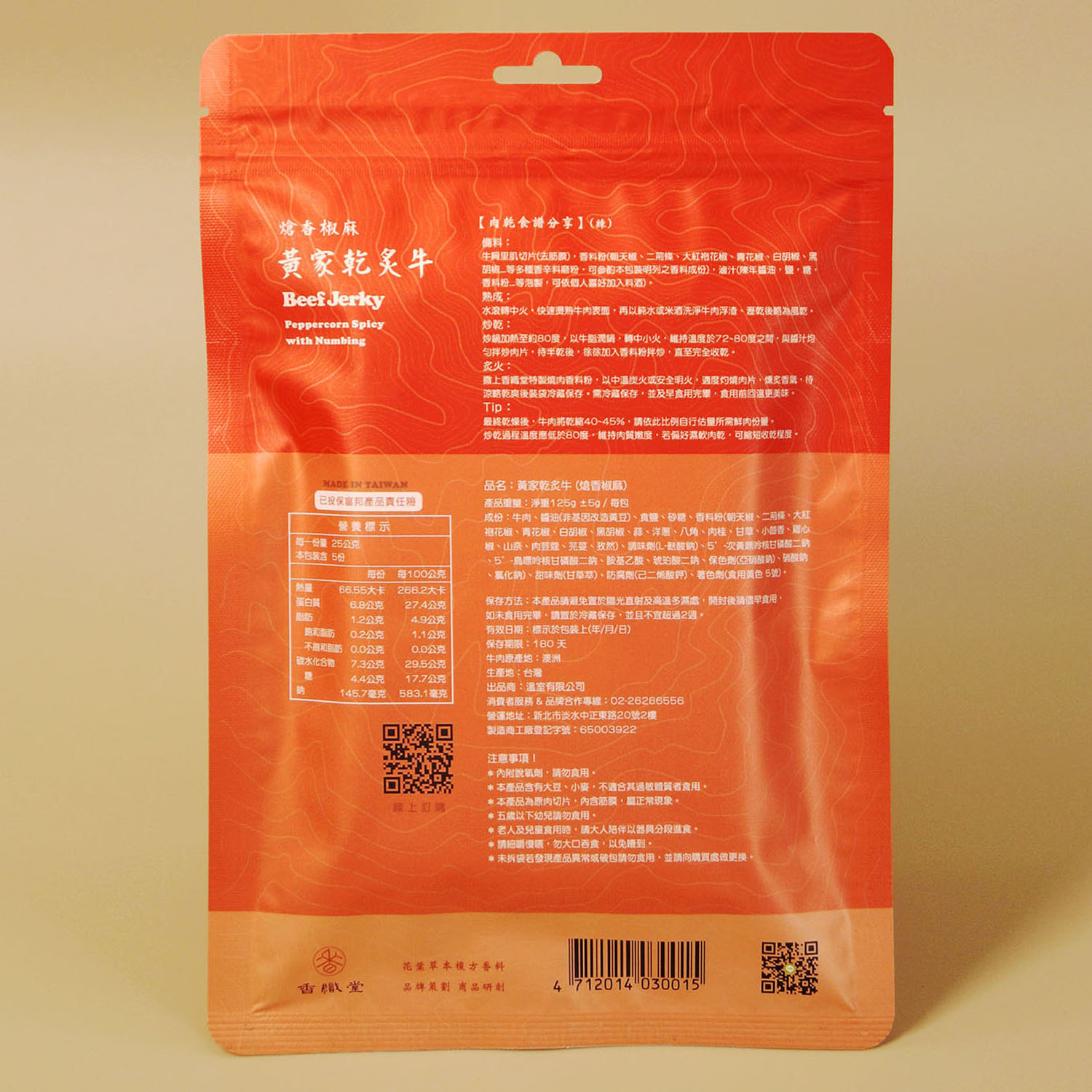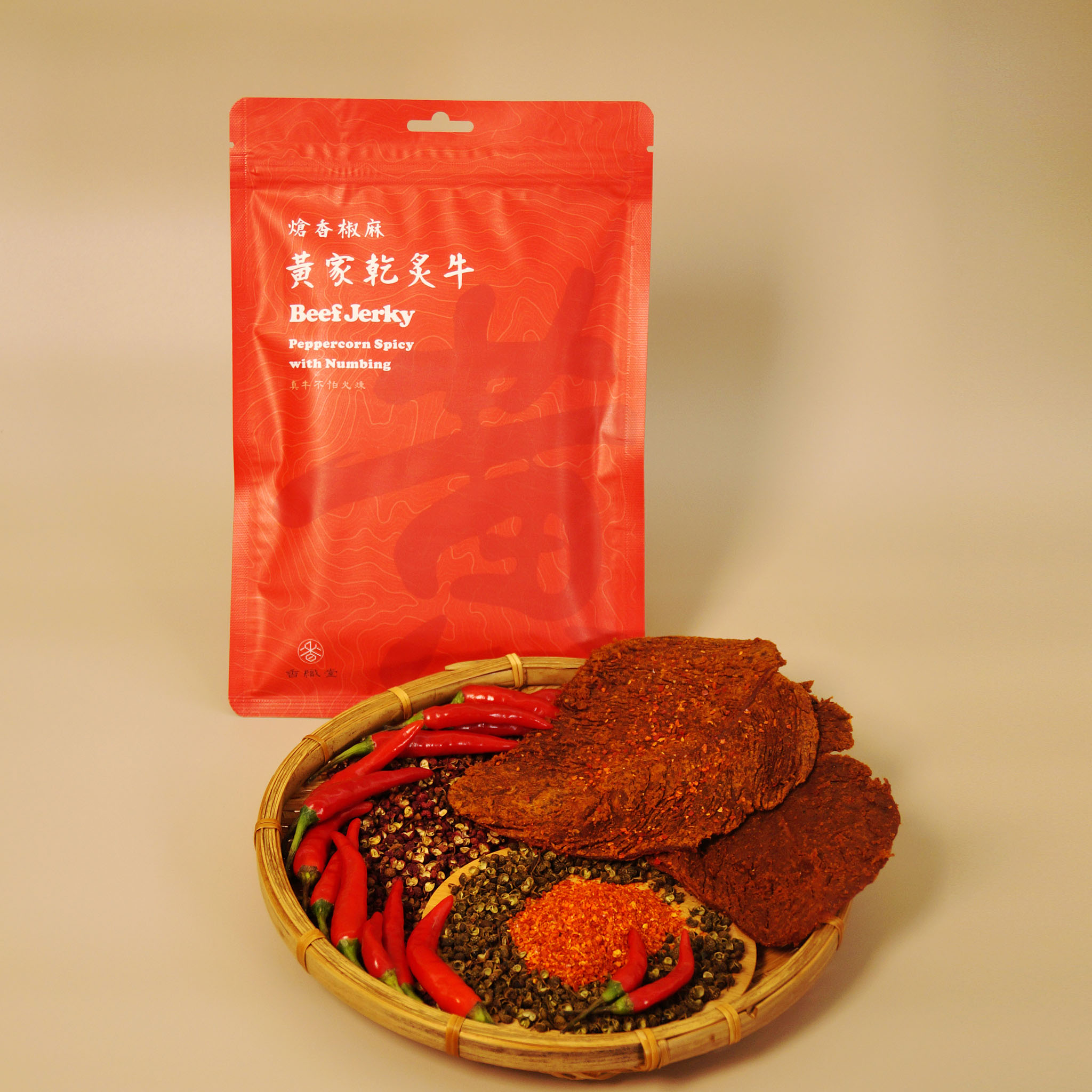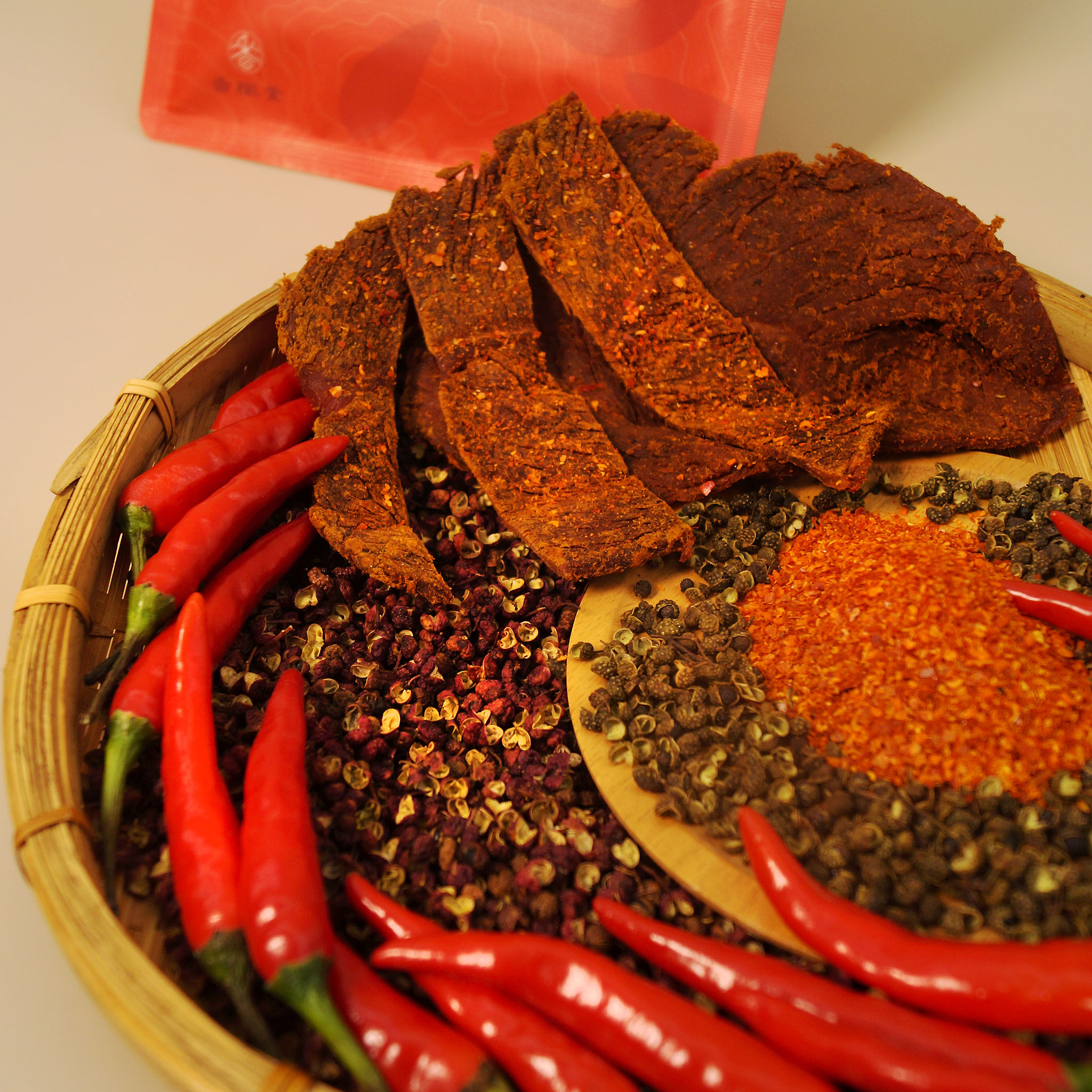 牛肩里肌切片(去筋膜),香料粉(朝天椒、二荊條、大紅袍花椒、青花椒、白胡椒、黑胡椒...等多種香辛料磨粉,可參酌本包裝明列之香料成份),滷汁(陳年醬油,鹽,糖,香料粉...等泡製,可依個人喜好加入料酒)。